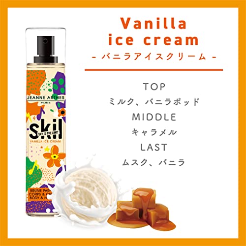 La Brume Parfumée corps et cheveux SKIL VANILLA ICE CREAM est une sensation de caresse rafraîchissante et délicieuse aux notes onctueuses et lactées.